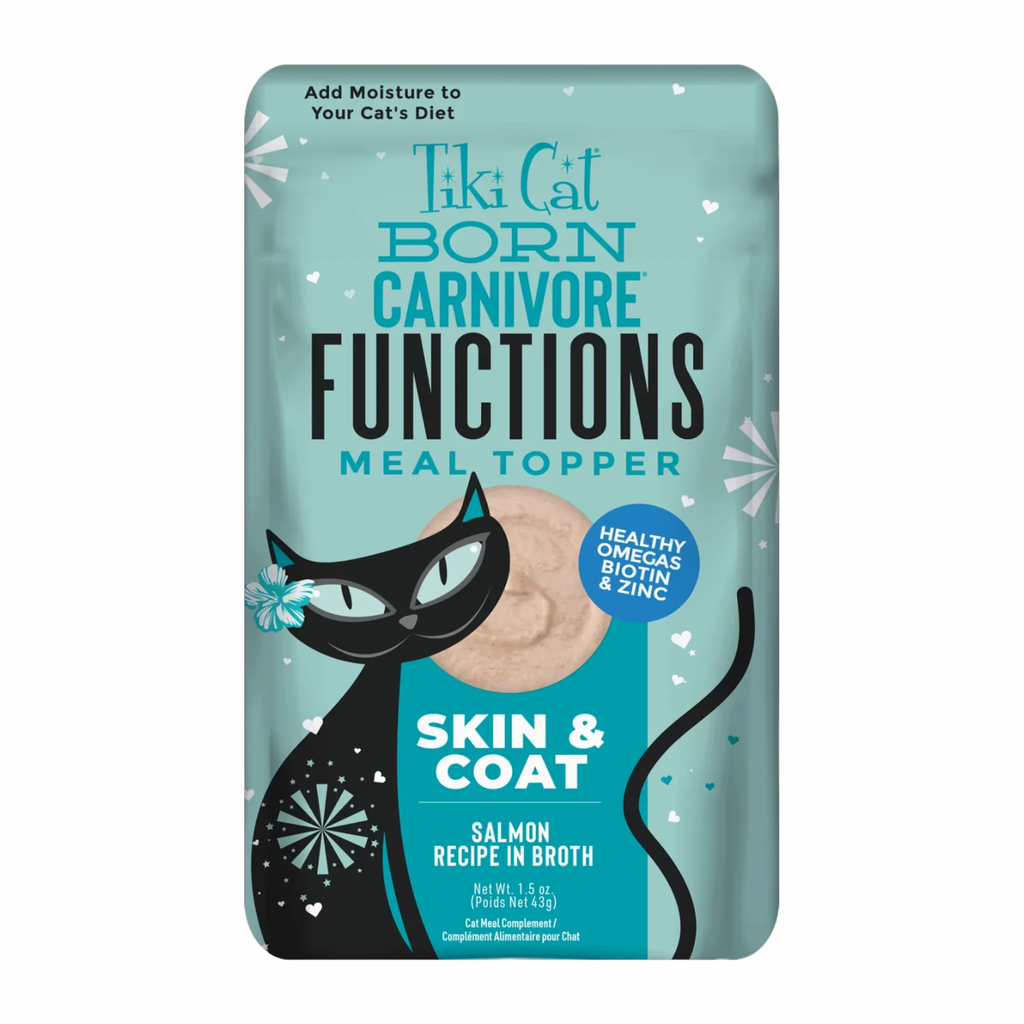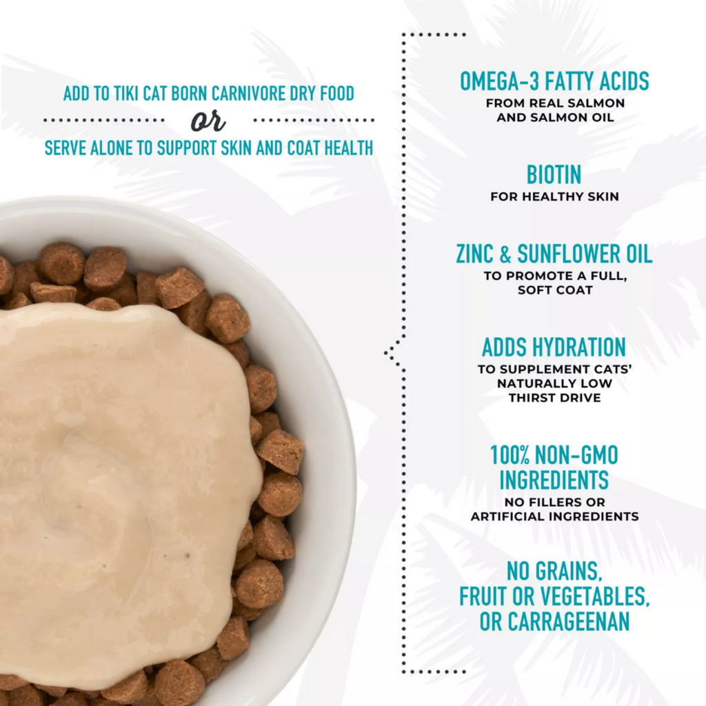 Supports Healthy Skin & Coat. Tiki Cat® Solutions™ Skin + Coat Topper is a protein-rich gravy made with real salmon, omega-3 essential fatty acid sources, and vitamin E to supports healthy skin & coat. Top your cat’s kibble for an added boost of moisture and benefits or feed it as a treat.