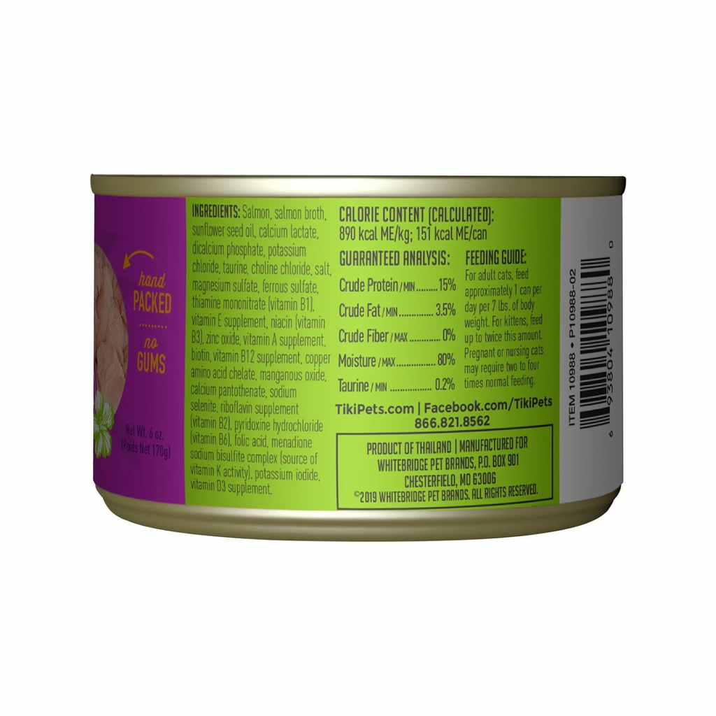 Salmon, salmon broth, sunflower seed oil, calcium lactate, dicalcium phosphate, potassium chloride, taurine, choline chloride, salt, magnesium sulfate, ferrous sulfate, thiamine mononitrate (vitamin B1), vitamin E supplement, niacin (vitamin B3), zinc oxide, vitamin A supplement, biotin, vitamin B12 supplement, copper amino acid chelate, manganous oxide, calcium pantothenate, sodium selenite, riboflavin supplement (vitamin B2), pyridoxine hydrochloride (vitamin B6), folic acid, menadione sodium bisulfite complex (source of vitamin K activity), potassium iodide, vitamin D3 supplement.