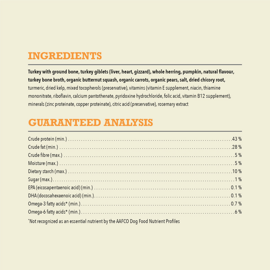 Turkey with ground bone, turkey giblets (liver, heart, gizzard), whole herring, pumpkin, natural flavor, turkey bone broth, organic butternut squash, organic carrots, organic pears, salt, dried chicory root, turmeric, dried kelp, mixed tocopherols (preservative), vitamins (vitamin E supplement, niacin, thiamine mononitrate, riboflavin, calcium pantothenate, pyridoxine hydrochloride, folic acid, vitamin B12 supplement), minerals (zinc proteinate, copper proteinate), citric acid (preservative), rosemary extract.