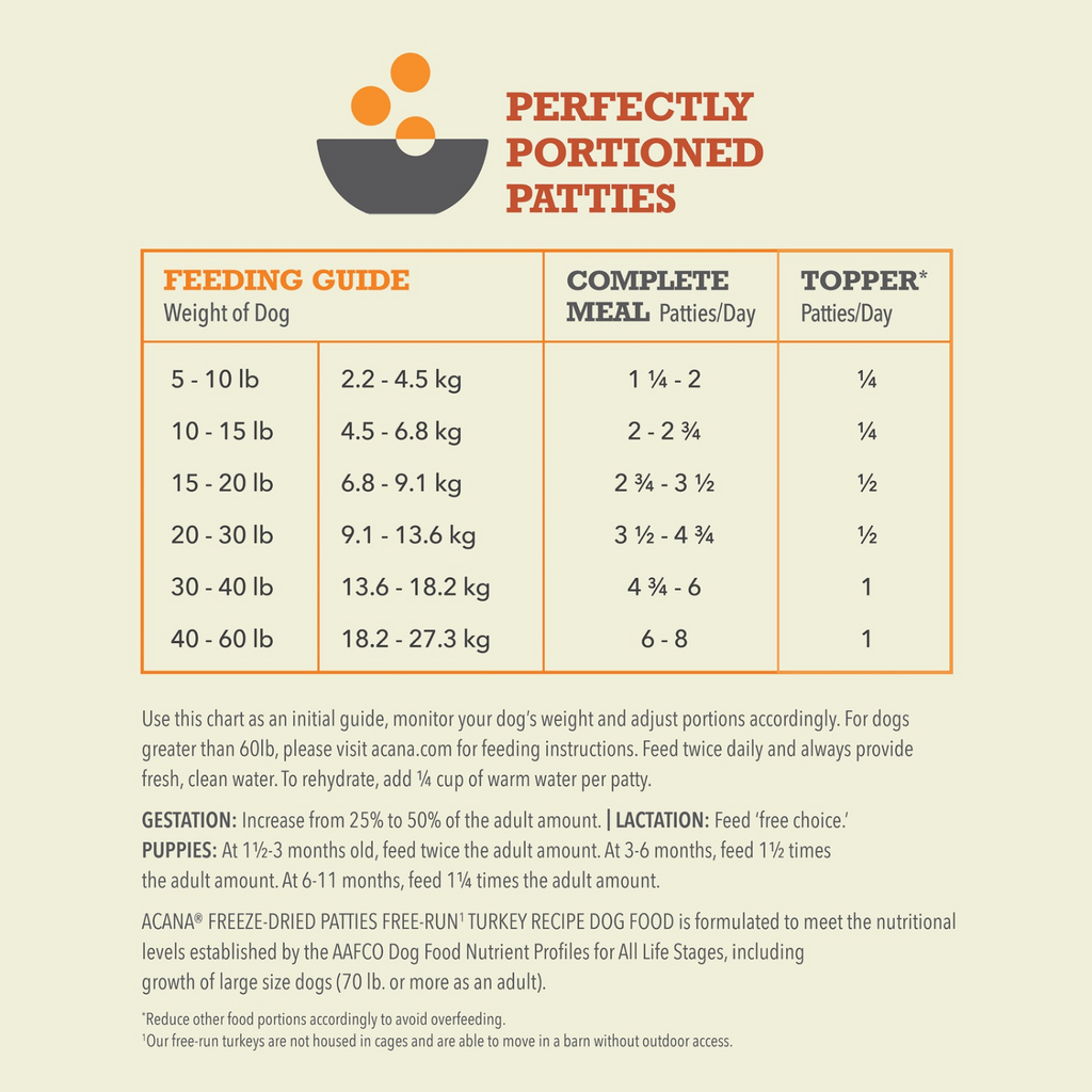 ACANA Freeze-Dried Patties Free-Run Turkey Recipe Is formulated to meet the nutritional levels established by the AAFCO Dog Food Nutrient Profiles for All Life Stages, including growth of large size dogs (70 lb. or more as an adult).