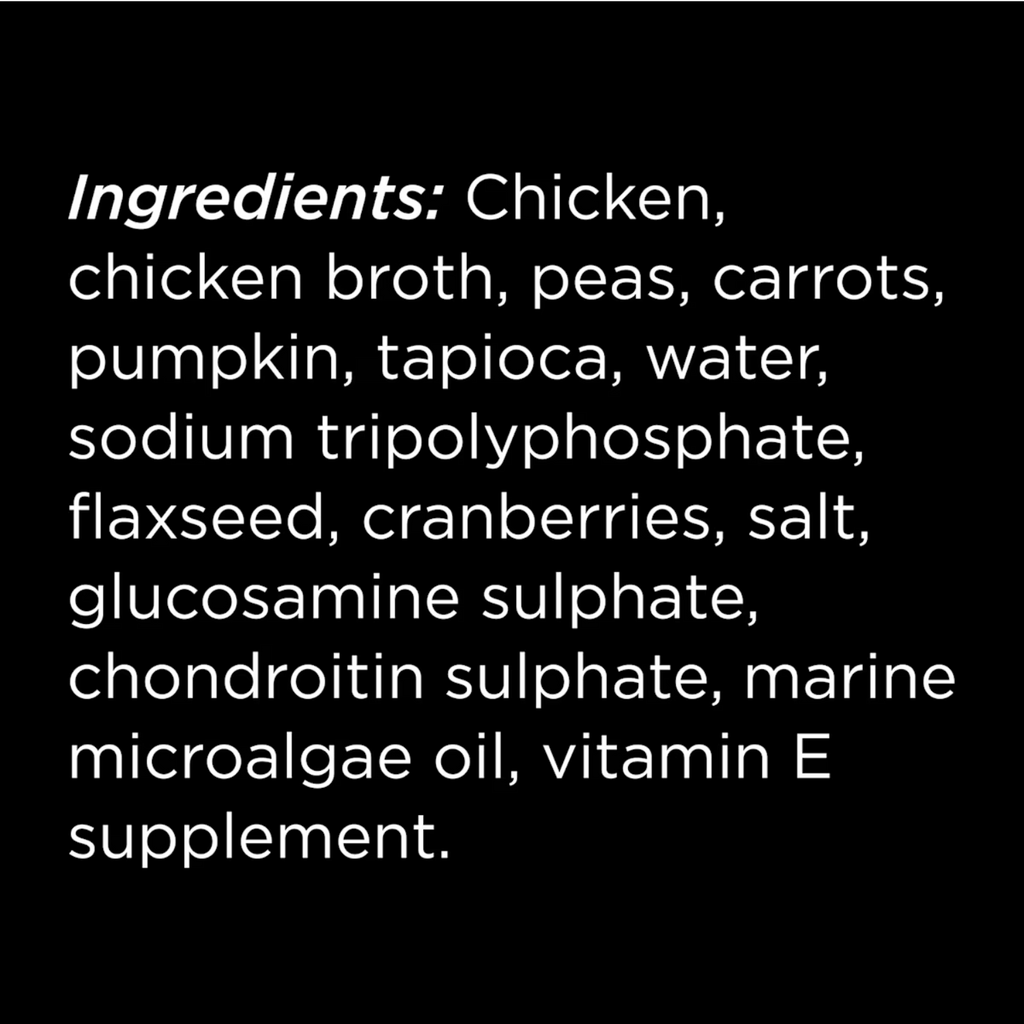 Chicken, chicken broth, peas, carrots, pumpkin, tapioca, water, sodium tripolyphosphate, flaxseed, cranberries, salt, glucosamine sulphate, chondroitin sulphate, marine microalgae oil, vitamin E supplement