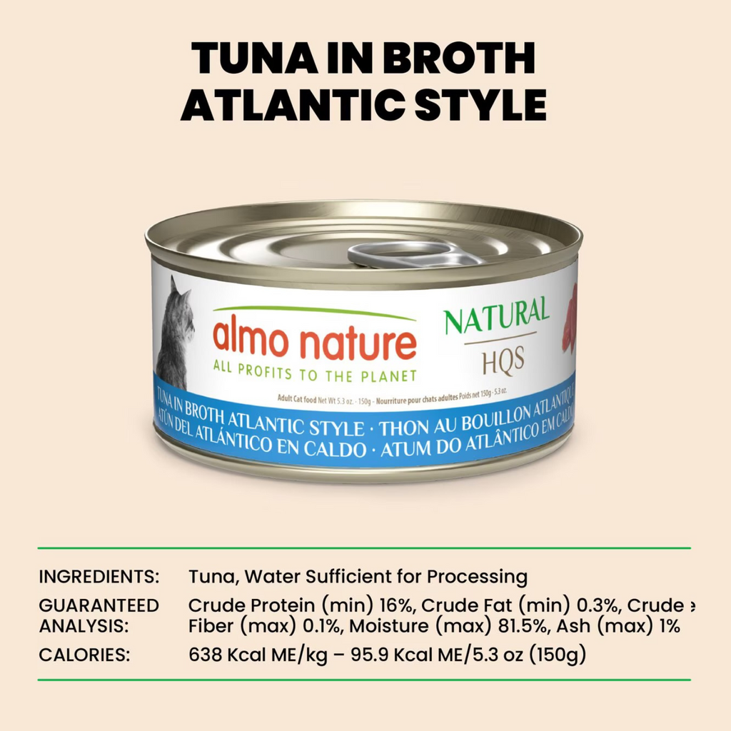 Give your cat a simple, high-quality cat treat made with just two natural ingredients. Almo Nature HQS Natural Tuna in Broth Atlantic Style features 76% Atlantic tuna and 24% water—nothing more. It's a clean, protein-rich option ideal for cats with sensitivities or for pet parents who want total transparency.