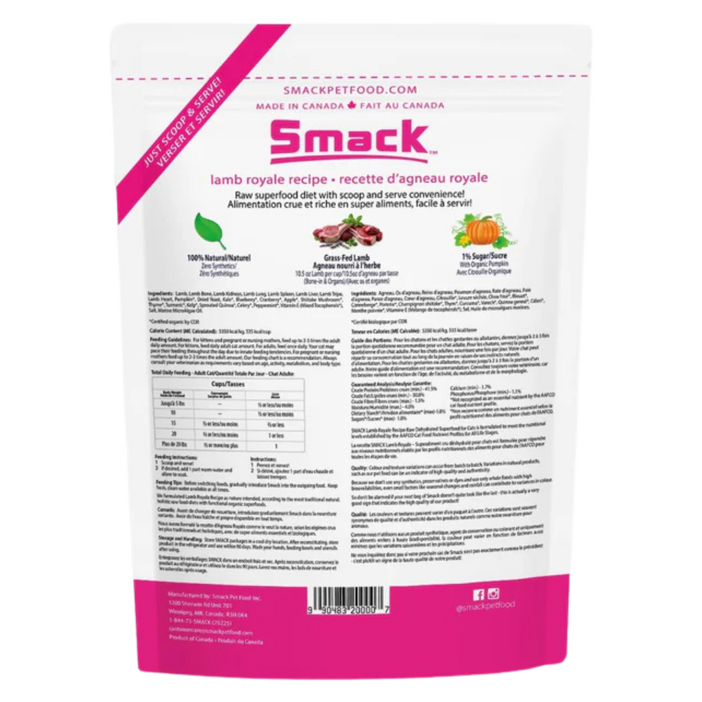 Smack Lamb Royale offers a biologically appropriate, raw cat food formula designed to nourish your feline with premium, whole food ingredients. Made with 83% grass-fed lamb—including bone and organs—plus 17% certified organic fruits and vegetables, this nutrient-rich recipe supports immune health, digestion, and overall vitality.