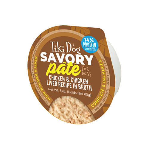 Tiki Dog® has the irresistible Flavors Your Dog Will Love. Tiki Dog® Savory Pate is crafted from high-quality chicken and organ meat, providing your dog with the protein they crave. Nutrient-dense organ meat delivers delectable palatability and an extra boost of protein, all in a smooth, finely minced and easy-to-eat pate that your dog will love. Convenient serving cups make feeding quick and easy and is ideal for small to medium sized dogs.