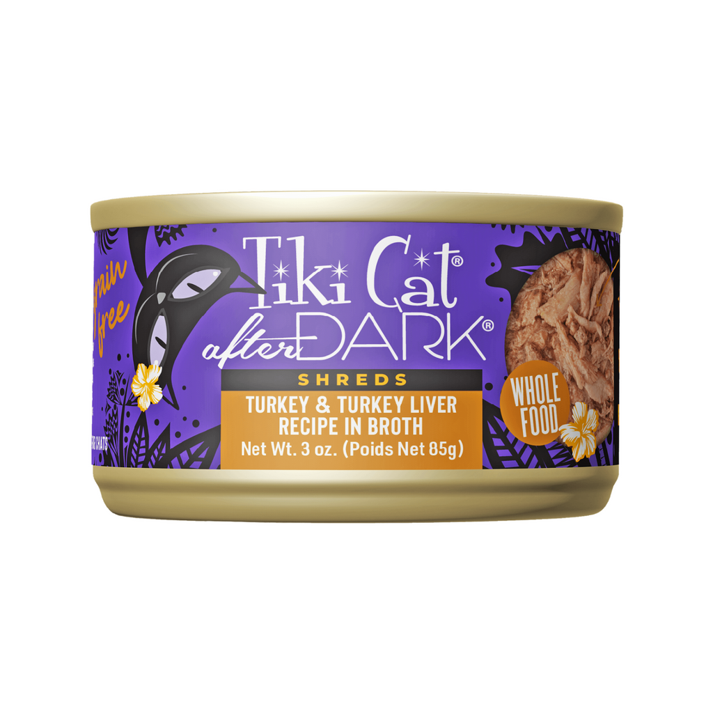 Tiki Cat® After Dark® Shreds Turkey & Turkey Liver Recipe is protein-rich, with delicious shreds of turkey and turkey liver in a savory broth. Organ meat enhances palatability while providing essential vitamins and minerals.