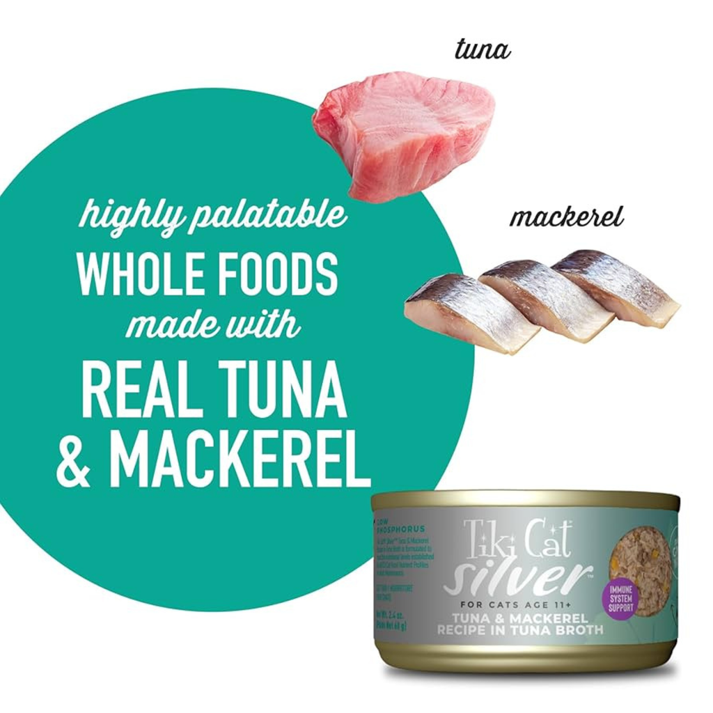 Keep them shining bright in their silver years with nutrition designed just for aging cats. Tiki Cat Silver Tuna & Mackerel Recipe in Tuna Broth gives senior cats the nutrition they need and the flavor they deserve, with high protein to maintain weight and muscle mass, and optimal omegas and vitamins to support strong immune systems. With soft texture and enticing flavor, it’s customized nutrition they’ll crave.