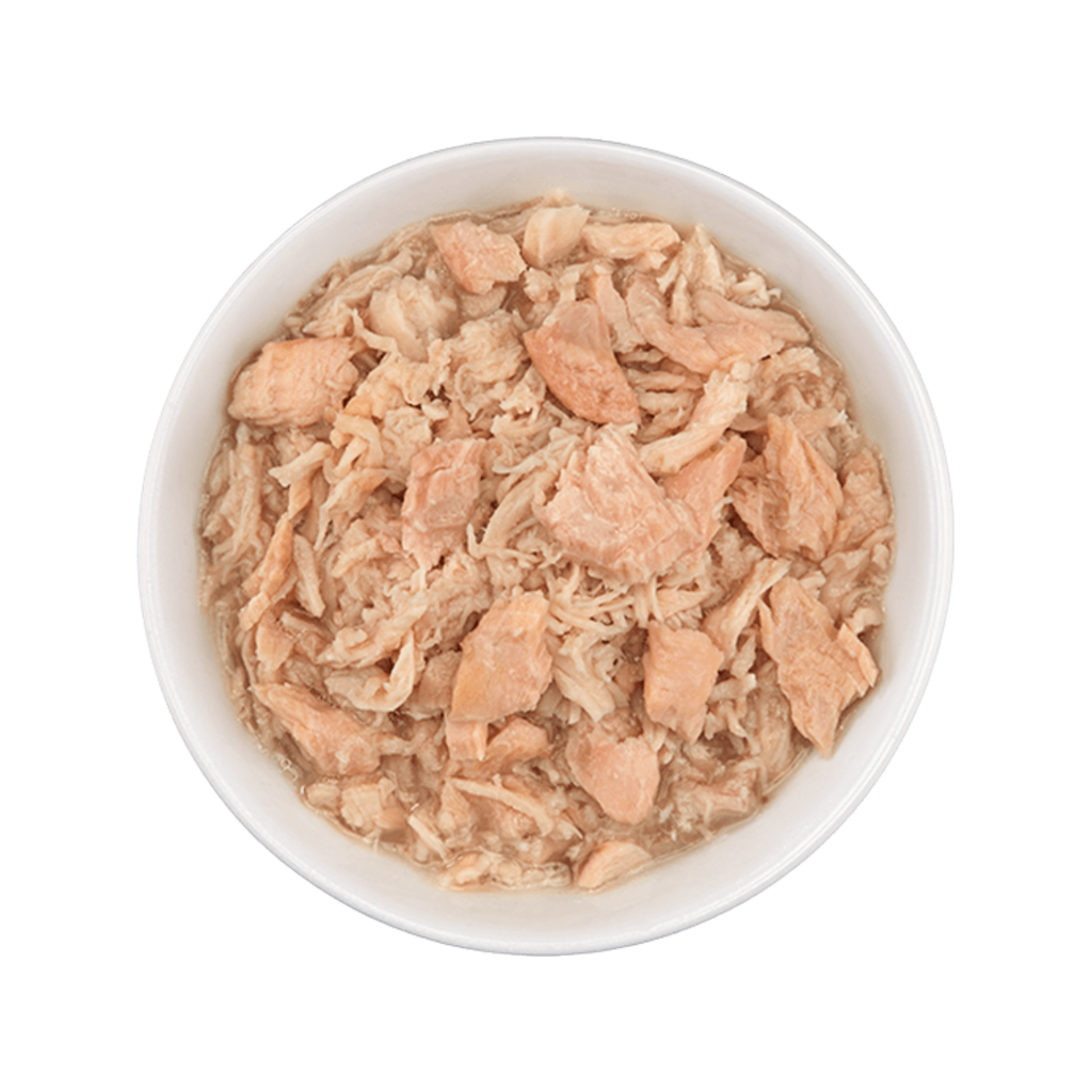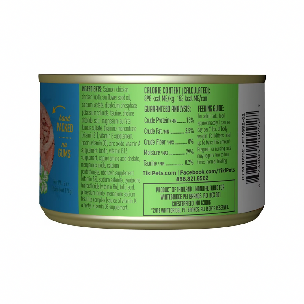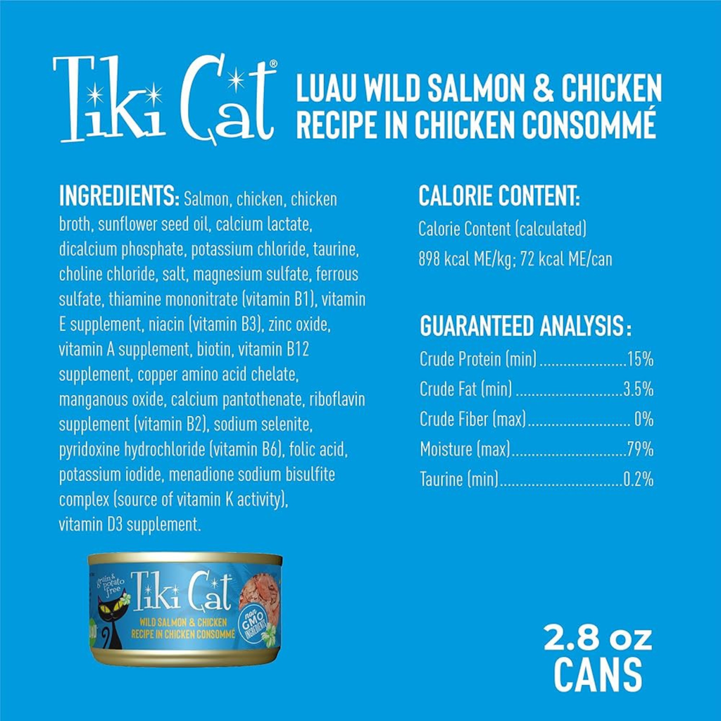 Salmon, chicken, chicken broth, sunflower seed oil, calcium lactate, dicalcium phosphate, potassium chloride, taurine, choline chloride, salt, magnesium sulfate, ferrous sulfate, thiamine mononitrate (vitamin B1), vitamin E supplement, niacin (vitamin B3), zinc oxide, vitamin A supplement, biotin, vitamin B12 supplement, copper amino acid chelate, manganous oxide, calcium pantothenate, riboflavin supplement (vitamin B2), sodium selenite, pyridoxine hydrochloride (vitamin B6), folic acid, potassium iodide, menadione sodium bisulfite complex (source of vitamin K activity), vitamin D3 supplement.