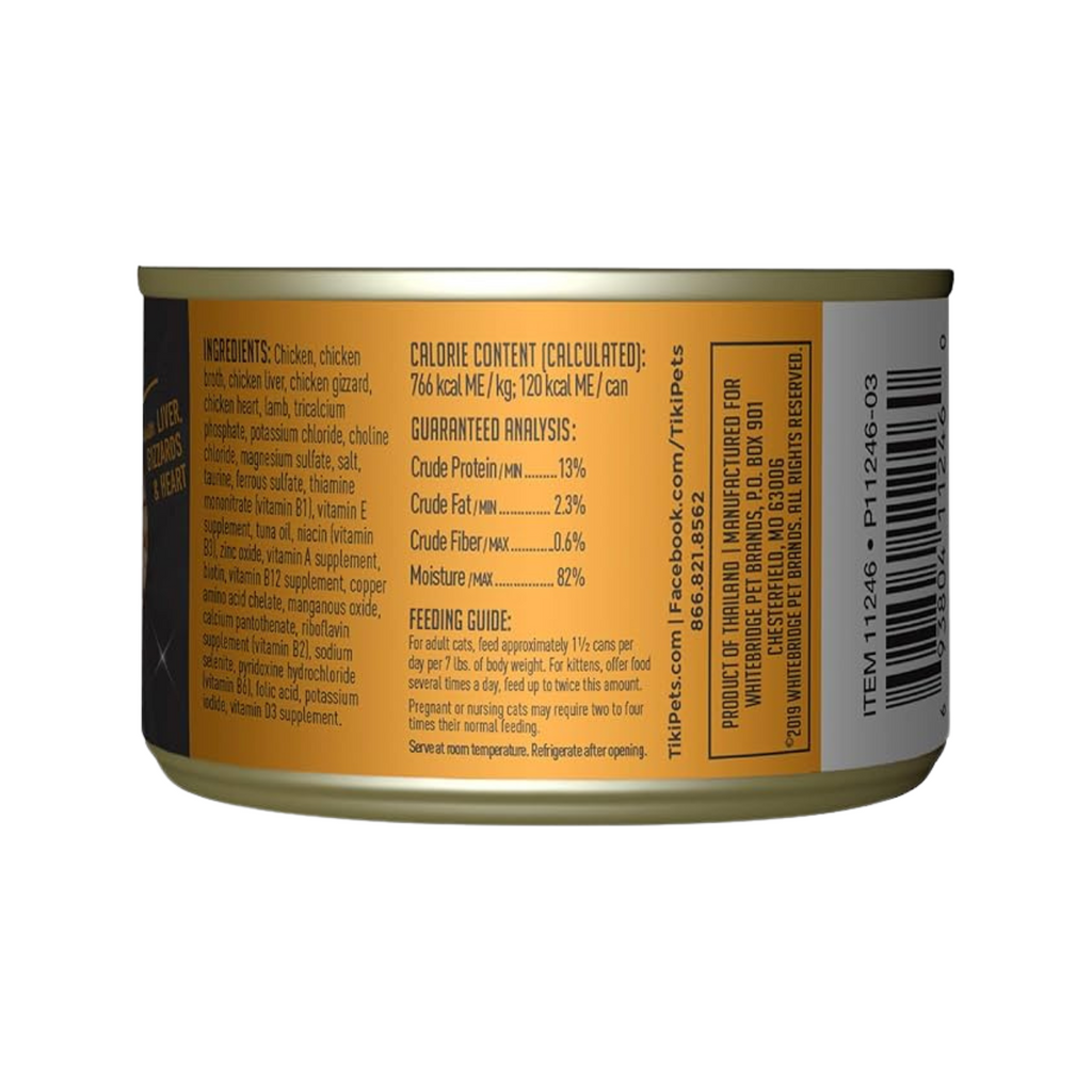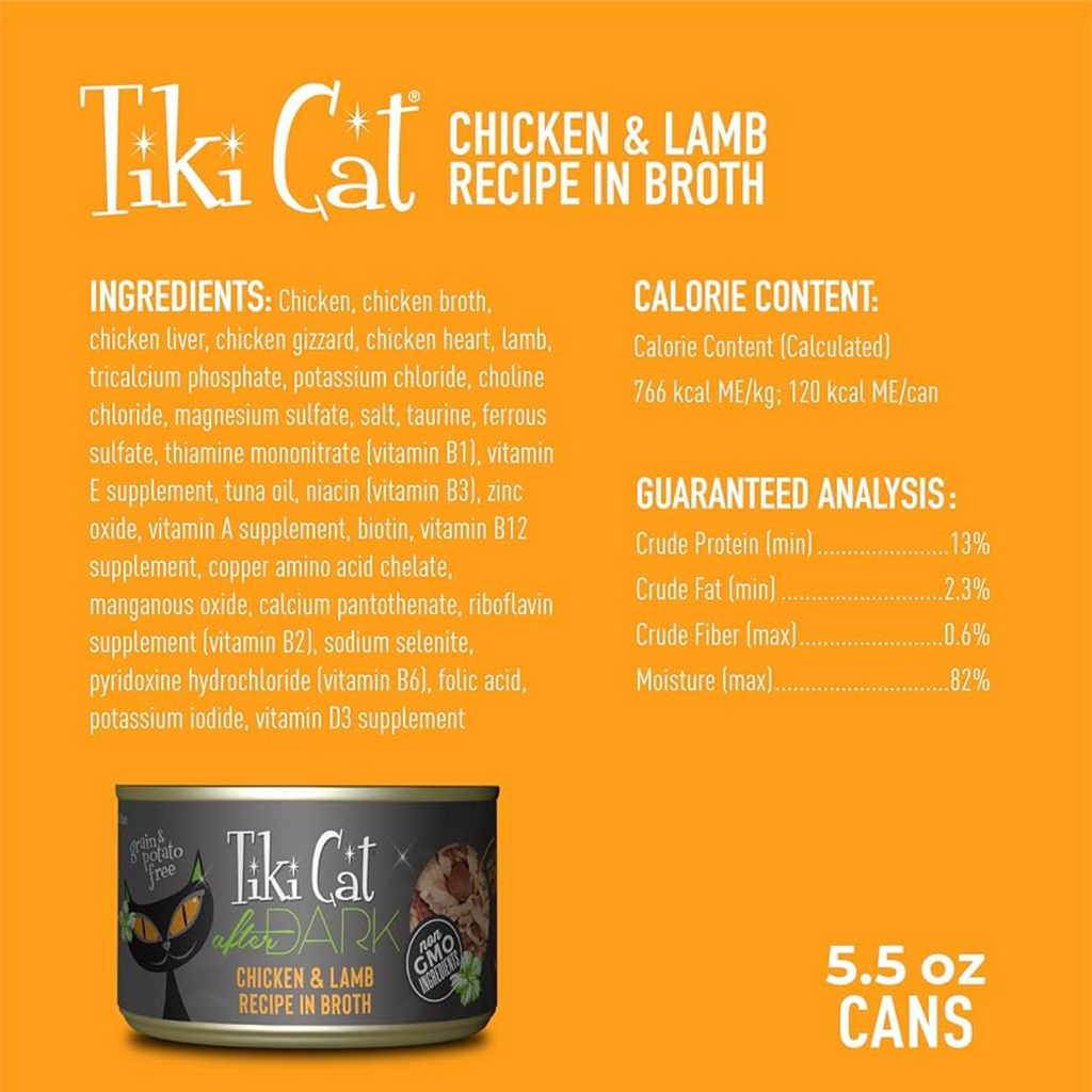 Chicken, chicken broth, chicken liver, chicken gizzard, chicken heart, lamb, tricalcium phosphate, potassium chloride, choline chloride, magnesium sulfate, salt, taurine, ferrous sulfate, thiamine mononitrate (vitamin B1), vitamin E supplement, tuna oil, niacin (vitamin B3), zinc oxide, vitamin A supplement, biotin, vitamin B12 supplement, copper amino acid chelate, manganous oxide, calcium pantothenate, riboflavin supplement (vitamin B2), sodium selenite, pyridoxine hydrochloride (vitamin B6), folic acid, potassium iodide, vitamin D3 supplement