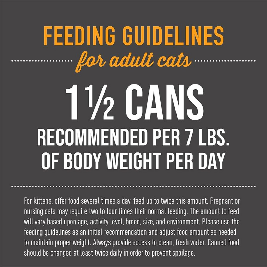 Three 2.8 oz cans per day OR two 5.5 oz cans per day for 7 lb. adult cats. For kittens, offer food several times a day, feed up to twice this amount.
