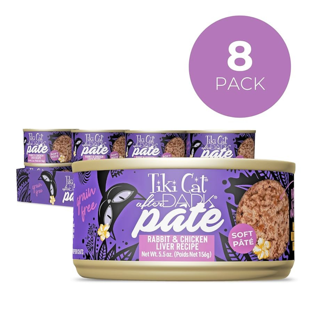 Tiki Cat® After Dark® Pâté is a complete and balanced meal that closely mimics cats’ natural prey diets as obligate carnivores, featuring real, finely minced rabbit and chicken liver in a savory, easy-to-eat pâté.