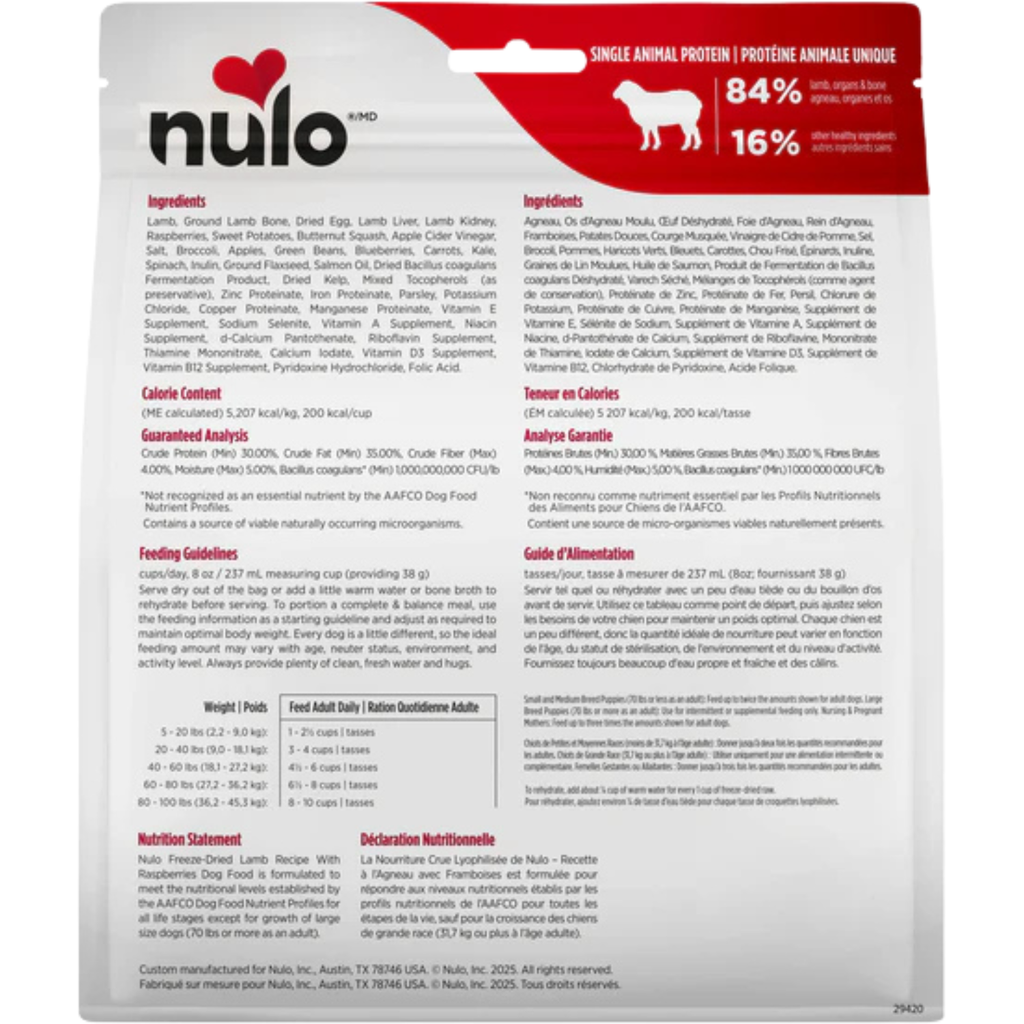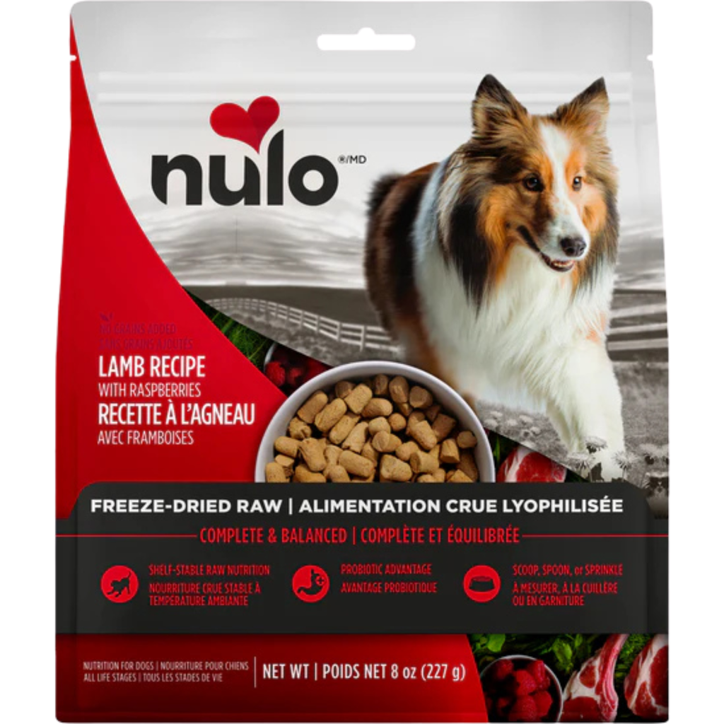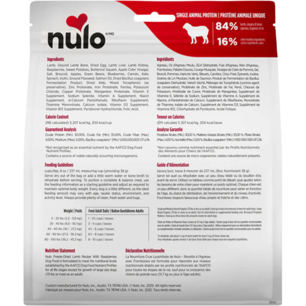 Nulo Freeze-Dried Lamb Recipe with Raspberries Dog Food is formulated to meet the nutritional levels established by the AAFCO Dog Food Nutrient Profiles for all life stages except for growth of large size dogs (70 lbs or more as an adult).